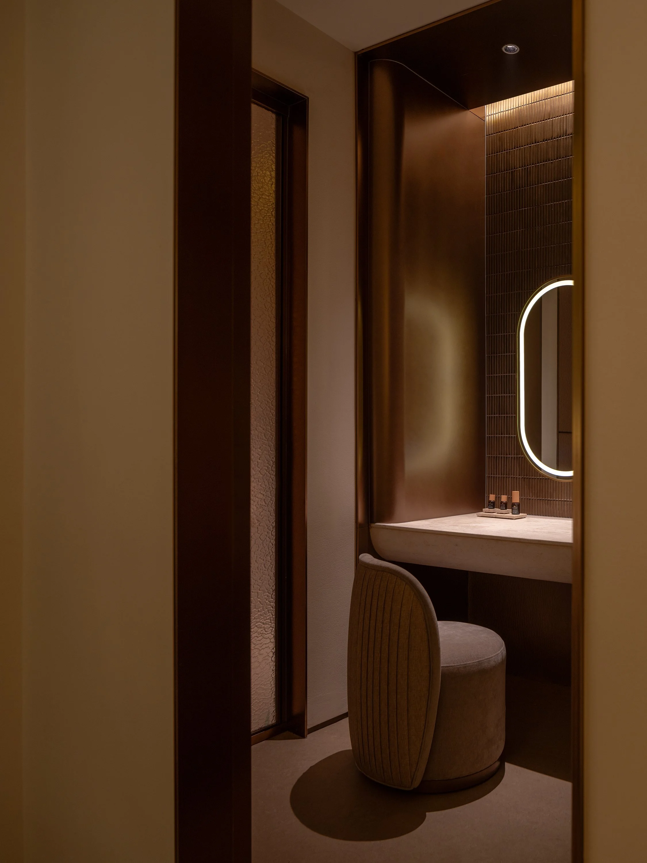 The healing begins the moment one enters. The circulation is designed as a sequence of transitions: from entrance to lounge, sound gradually recedes, and light softens. The density of air, the scale of the corridor, and the lightness of fabric partitions quietly guide the body toward ease—steps slow down, voices soften.