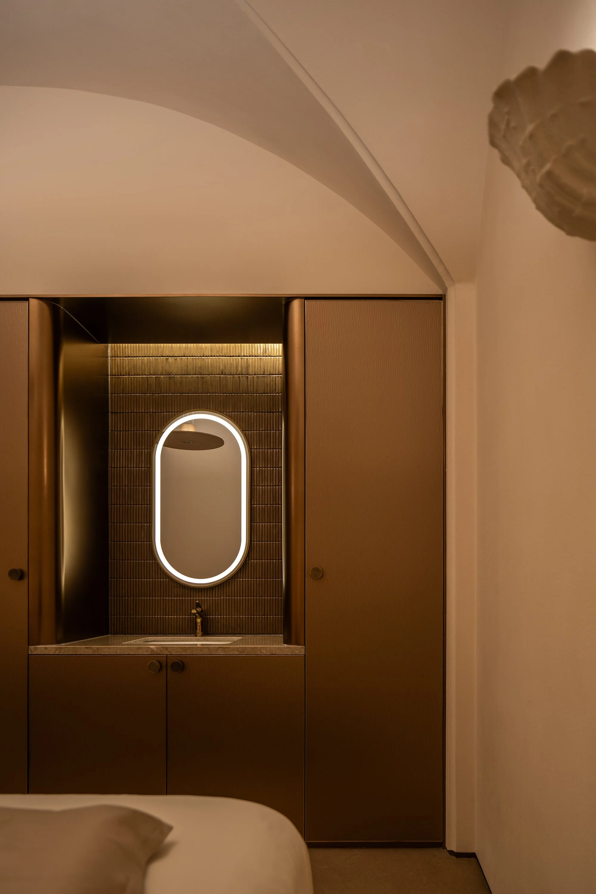 From vaulted ceilings and gentle curves to vertical lines, we drew upon classical architectural language to construct a stable spatial framework. Low-saturation materials quiet the visual field, while light glides along the arches, creating a luminance softened as if by time itself. The atmosphere avoids grandeur, favoring instead a sense of calm—one that feels as though it stands within the continuity of the eternal.