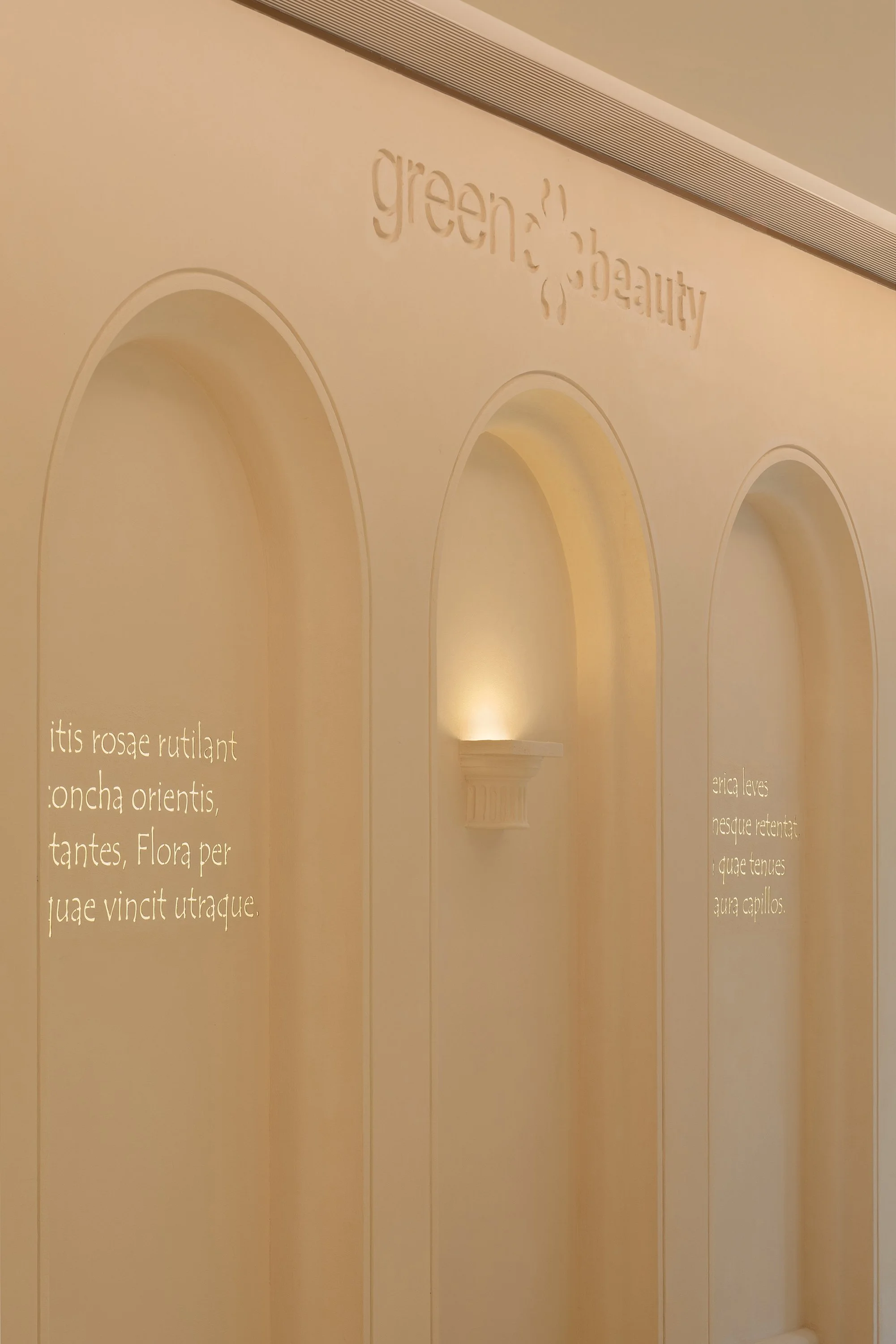 Amid the density and noise of the mall, we created a place where time gently slows down — "green beauty". Inspired by Venus, the goddess of beauty and rebirth, the space translates the timeless dialogue among classicism, humanity, and nature into a spatial language. From the moment visitors step inside, they encounter a sense of quiet separation from the outside world.